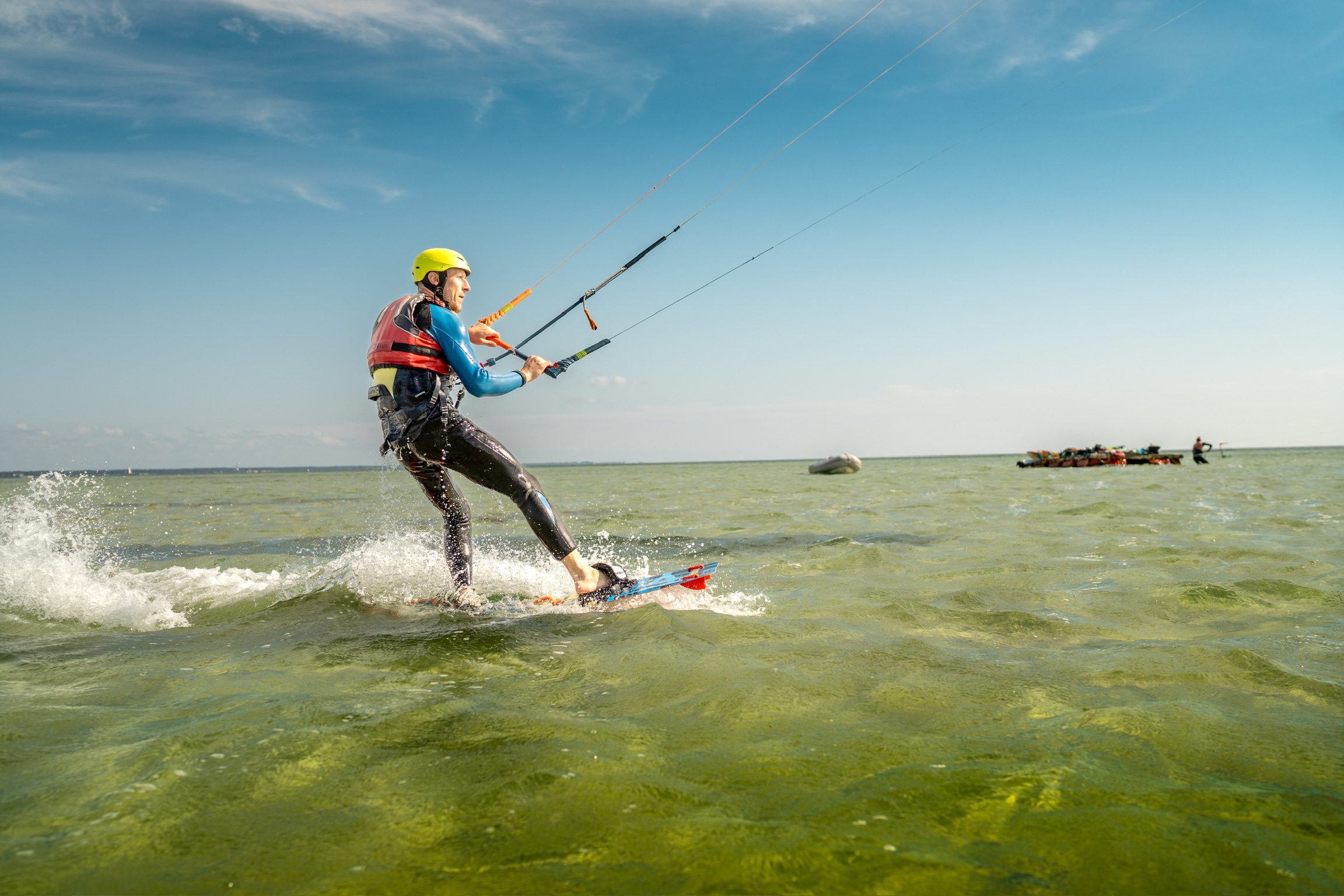 Gdy przy brzegu wiatr nie jest najmocniejszy na zajęcia z kitesurfingu zawsze możemy popłynąć pontonem na płyciznę na zatoce, gdzie wiatr "wchodzi" najlepiej!